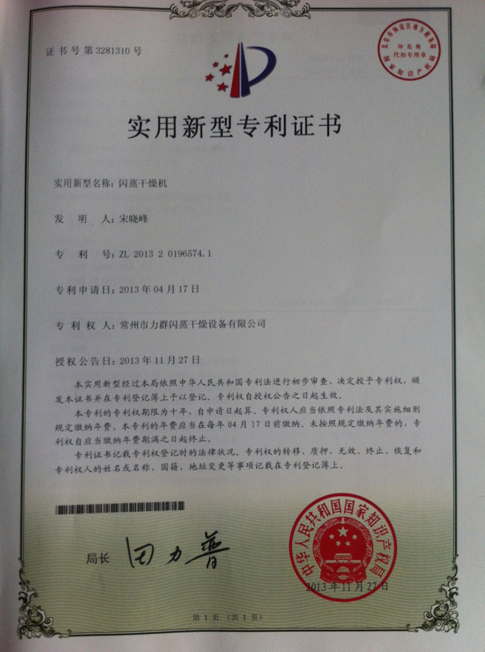 由我公司申請(qǐng)的“閃蒸干燥機(jī)”通過(guò)國(guó)家知識(shí)產(chǎn)權(quán)局的審核,并取得實(shí)用新型專(zhuān)利證書(shū),閃蒸干燥機(jī)專(zhuān)利號(hào)是:2013 -2-0196574.1