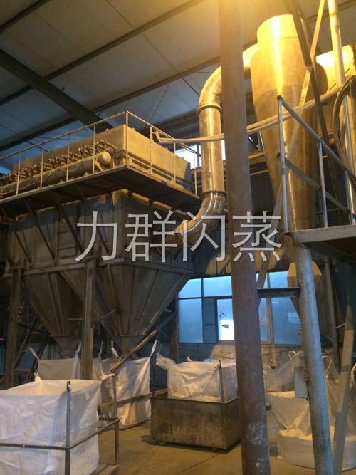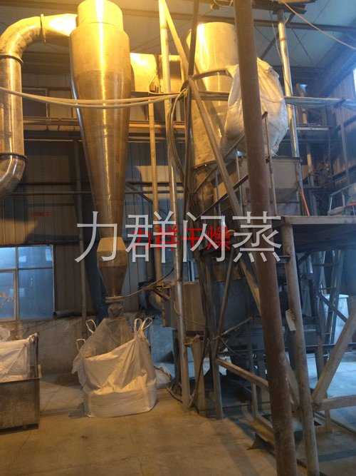 經(jīng)換熱器加熱后的潔凈空氣被鼓入進(jìn)風(fēng)口,以適宜的速度旋入干燥室底部的環(huán)隙,然后按切線方向進(jìn)入干燥室,并呈螺旋狀上升:同時,物料則由可無級調(diào)速的加料器定量加入塔內(nèi)。在干燥塔內(nèi),物料與熱空氣進(jìn)行充分、高效的質(zhì)熱變換,被干燥的粉狀物料隨同熱風(fēng)一起輸送至分離器,其中成品收集包裝,而尾氣則進(jìn)一步經(jīng)除塵裝置處理后排空。